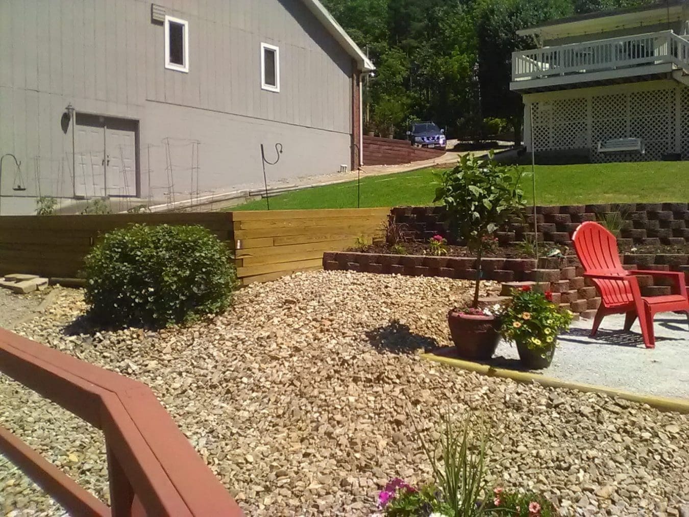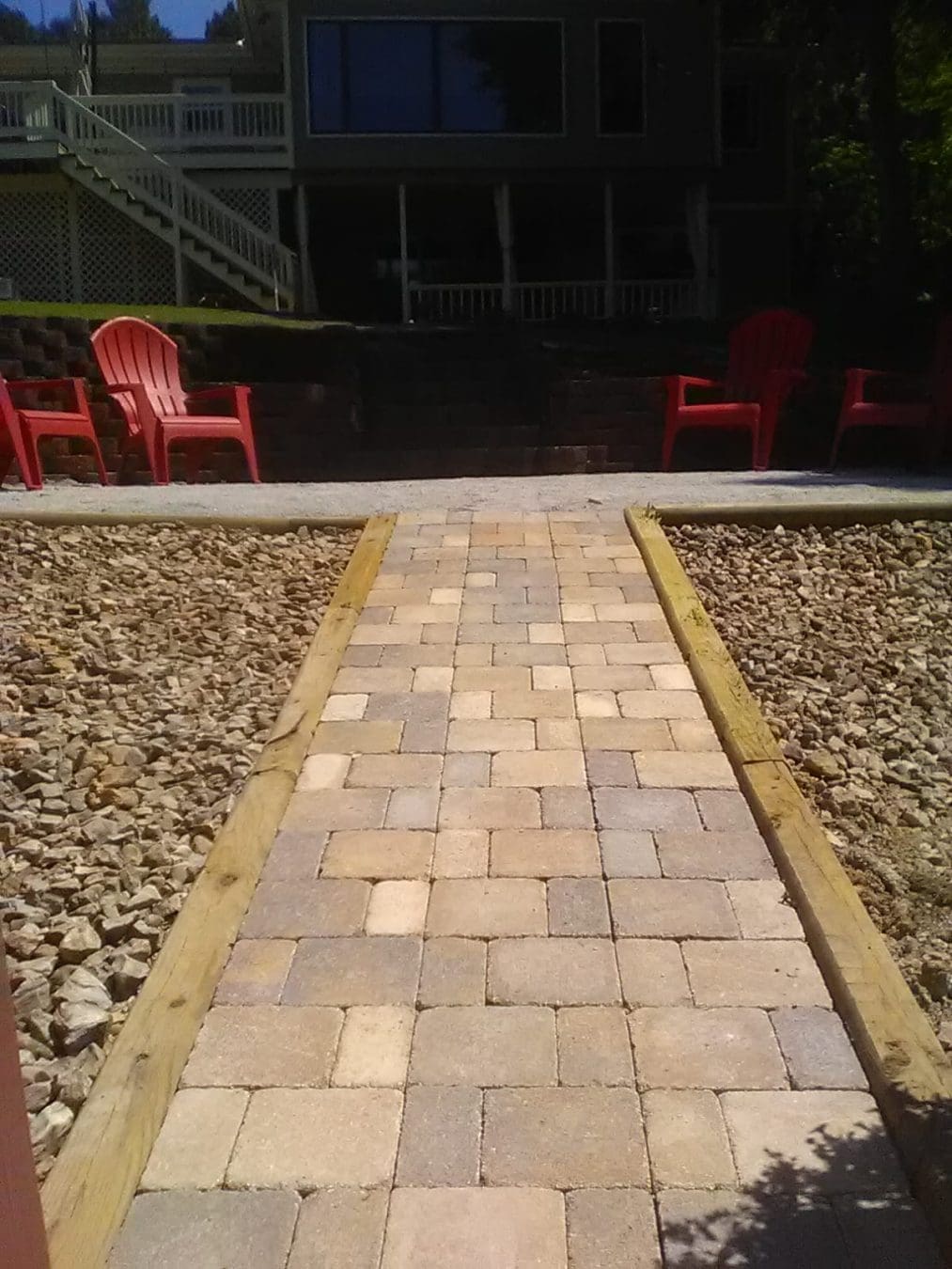We moved flowerbeds, built a couple of new ones. Added steps for better access to the lakefront, and a cute paver walkway to connect the house and steps together. The new hardscape paver walkway will serve as an aisle later this summer.